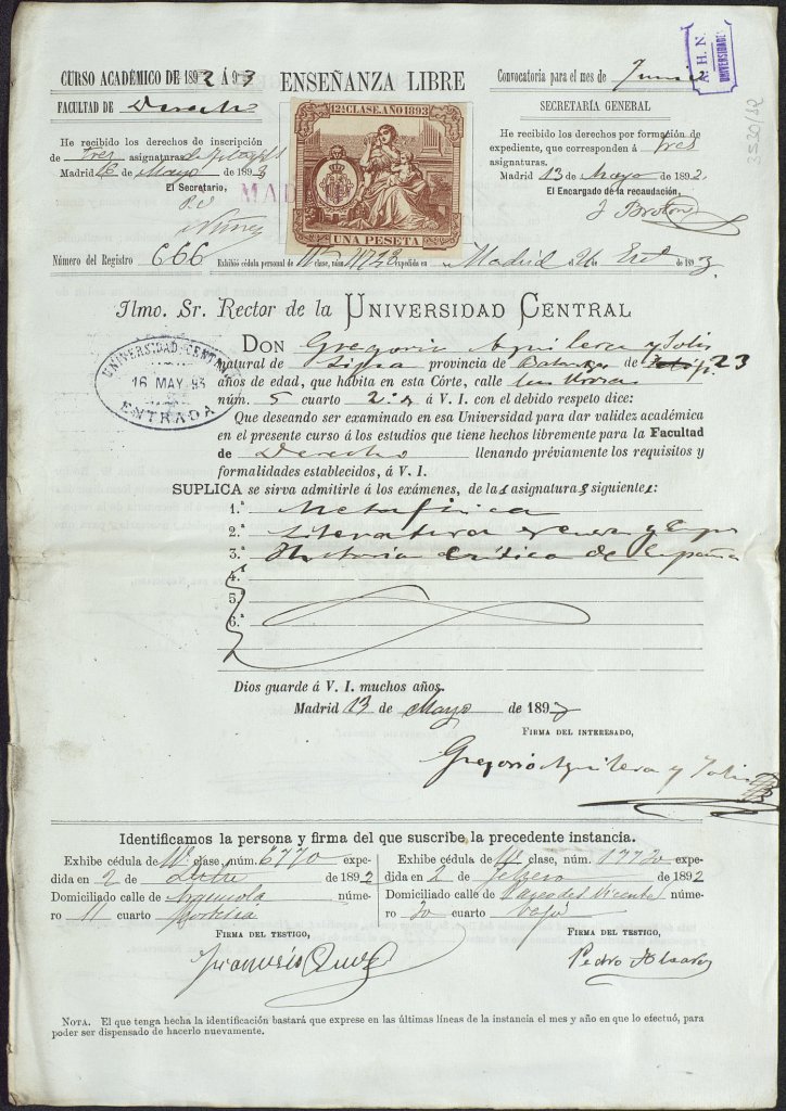 Since his childhood, “Goring”, as he was called, showed a clear intelligence and always carried the highest marks and the first prizes in his class. He obtained his Bachiller en Artes from the prestigious Ateneo Municipal de Manila. During his senior year, his teachers stripped him of the medal of excellence for a poem he had written surreptitiously against Spain which began with “Muera la madrasta España…” (Death to stepmother Spain). The Jesuits’ leniency in his punishment was striking given the heated political atmosphere of that time. As a repentance of sorts, Gregorio intended to join the priesthood and travelled to Europe in 1889. He was one of the few students under the pensionado program sponsored by the Spanish government.