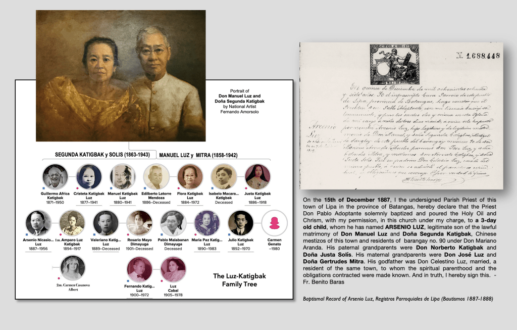 Arsenio Nicasio Luz y Katigbak was the fifth of nine children born on December 13, 1887, to a family of illustrious Chinese mestizo lineage. His father, Don Manuel Luz y Mitra, was a businessman and a Philippine revolutionary leader, and his mother, Doña Segunda Katigbak y Solís, was the first love interest of national hero Dr. José Rizal. The Luz family was engaged in the booming coffee business, and his ancestry, both maternal and paternal, included six gobernadorcillos of Lipa, namely: Don Juan Mitra (paternal great-grandfather, 1795, 1806), Don Tomás Luz (paternal great-grandfather, 1807), Don José Luz (paternal grandfather, 1844,1854), Don Celestino Solís (maternal great-grandfather, 1843, 1848, 1860-61), Don Josef Catigbac (maternal great-grandfather, 1827), and Don Norberto Catigbac (maternal grandfather, 1862).
